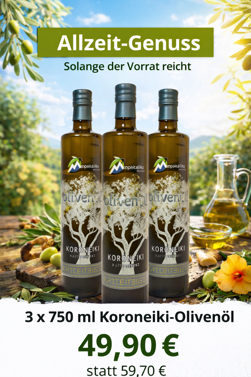 Genießt unser extra natives Koroneiki-Olivenöl jetzt im günstigen Dreierpack – ideal für alle, die in der Küche nicht auf gute Qualität verzichten wollen!